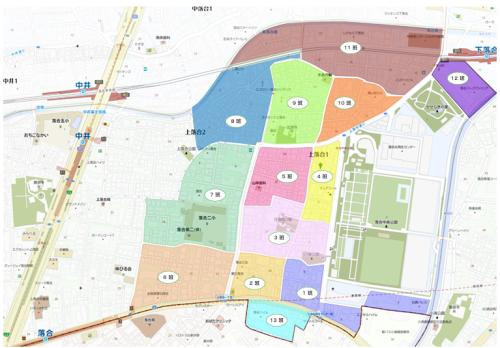 下図の色で示した部分が町会区域となります。町会はこの区域を13の班に分けています。